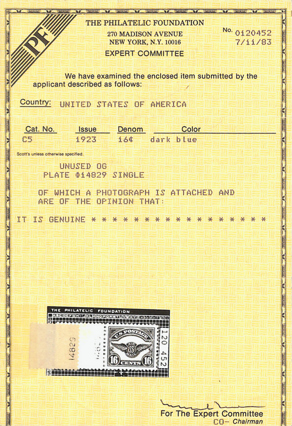 7249 og C5 imageAirmail, 1923, 16¢ dark blue (Scott C5), Nearly perfectly aligned margins, o.g., very lightly hinged, Extremely Fine, with 1983 P.F. certificate.