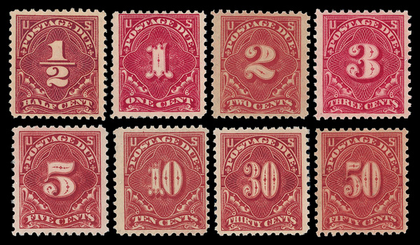 7269 nh J61-J68 imagePostage Dues, 1917-25, ½¢ to 50¢ complete, unwatermarked, perf. 11 (Scott J61-J68), set of 8, o.g., never hinged (1¢ & 5¢ hinged), Fine to Very Fine.