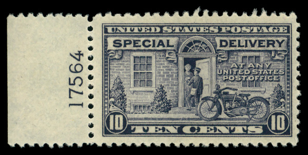 7262 nh E12a imageSpecial Delivery, 1922, 10¢ deep ultramarine (Scott E12a), plate number single, o.g., never hinged, Fine to Very Fine.