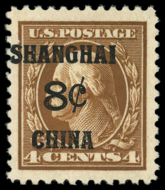7274 og K4 imageOffices in China, 1919, 8¢ on 4¢ brown (Scott K4), o.g., lightly hinged, jumbo margins, Extremely Fine to Superb.