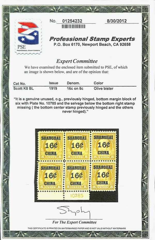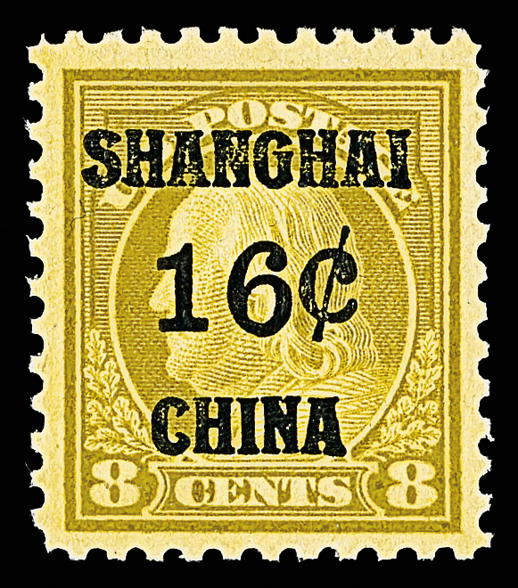 7278 nh K8 imageOffices in China, 1919, 16¢ on 8¢ olive bister (Scott K8), o.g., never hinged, a lovely stamp with rich, strong color and appealing centering, Very Fine, with photocopy of 2012 P.S.E. certificate for block of 6.
