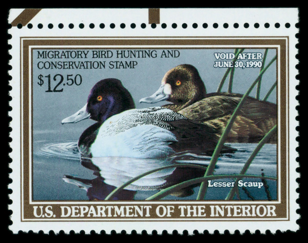 7334 nh RW56 imageFederal Duck Stamp, 1989, $12.50 Lesser Scaup (Scott RW56), o.g., never hinged, Very Fine to Extremely Fine.