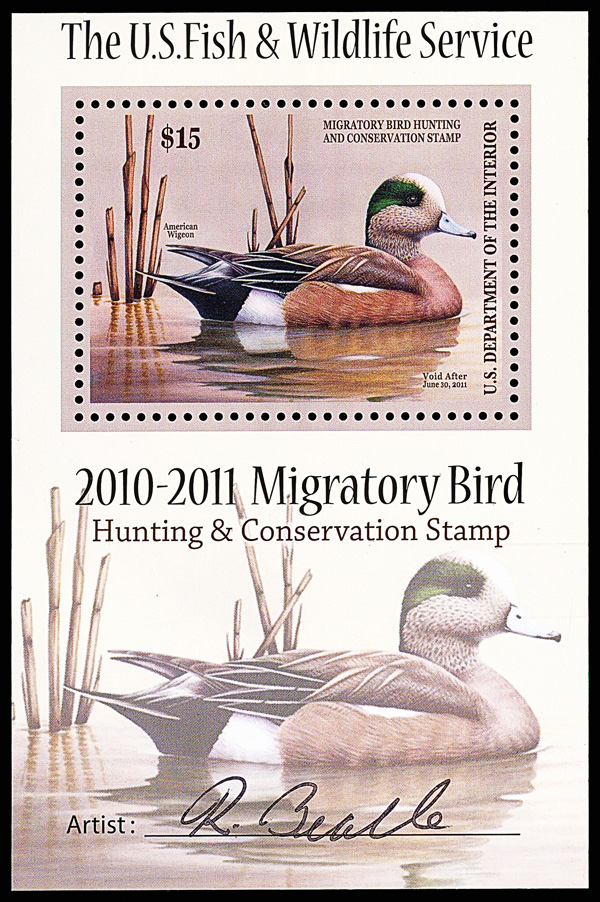 7344 nh RW77b imageFederal Duck Stamp, 2010, $15 American Wigeon, souvenir sheet of 1 (Scott RW77b), o.g., never hinged, fresh and sound, Very Fine.