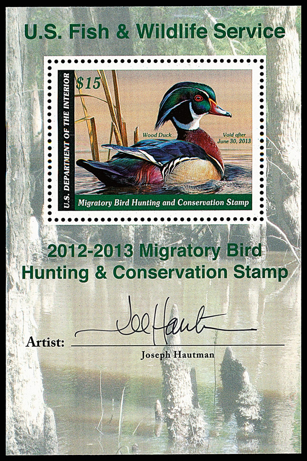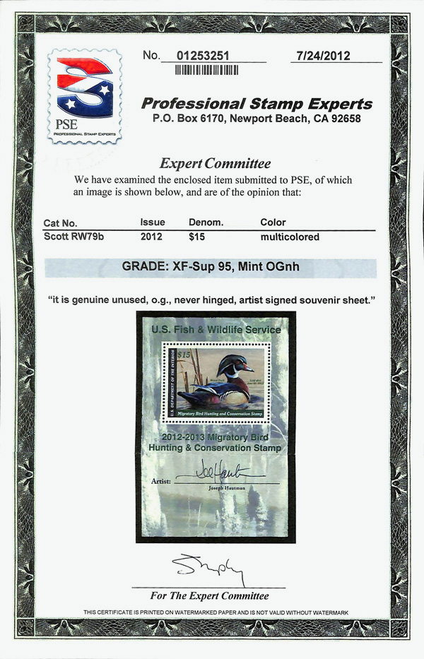 7345 nh RW79b imageFederal Duck Stamp, 2012, $15 Wood Duck, souvenir sheet of 1 (Scott RW79b), o.g., never hinged, Post Office fresh with superior centering, Extremely Fine to Superb, with 2012 P.S.E. certificate graded XF-SUP 95.