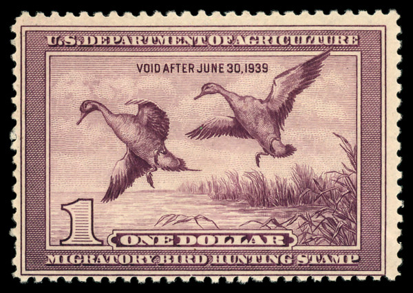 7322 og RW5 imageFederal Duck Stamp, 1938, $1 Pintail Drakes (Scott RW5), o.g., very lightly hinged (gum creases), Fine.