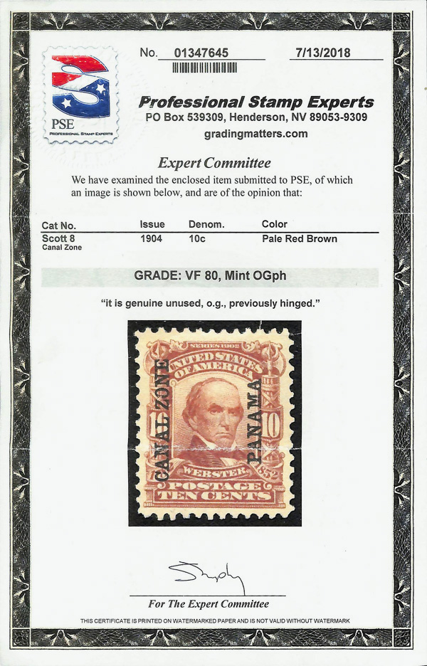 7358 og 8 image1904, 10¢ Webster, pale red brown (Scott 8), o.g., very lightly hinged, pristine with strong color and crisp impression, Very Fine, with 2018 P.S.E. certificate graded VF 80.