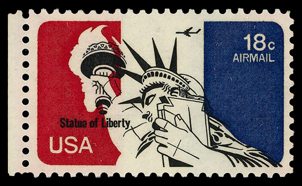 7355 nh C87 var. imageAirmail, 1974, 18¢ Statue of Liberty, color shift (Scott C87 var.), left margin single, incredibly centered example that features the color shifted around the torch and lady liberty, o.g., never hinged, Extremely Fine. (Image) Suggested Bid $32