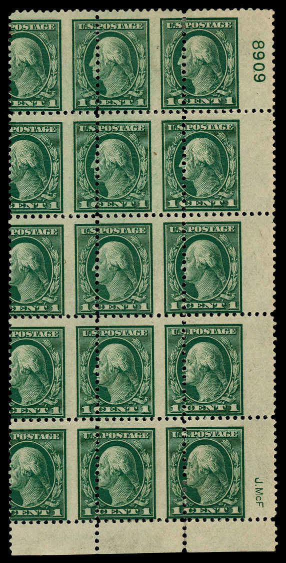 7349 ogbl 498 var. image1917, 1¢ green, perf. 11, misperforation (Scott 498 var.), bottom right plate block of 15 with siderographer's initials, vertical misperforations throughout; plate number 8909 and initials "J. McF", o.g., hinged (gum disturbances), Very Fine. (Image) Suggested Bid $200