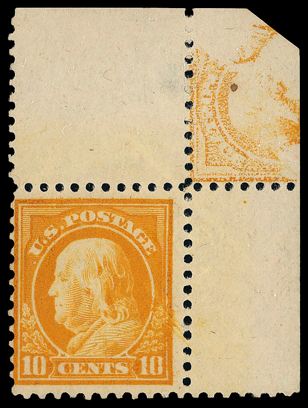 7350 nh 510 var. image1917, 10¢ orange yellow, perf. 11, reverse offset (Scott 510 var.), corner margin single, stunningly bright example with offset at upper right, o.g., never hinged (small spot of gum disturbance), Fine to Very Fine. (Image) Suggested Bid $80