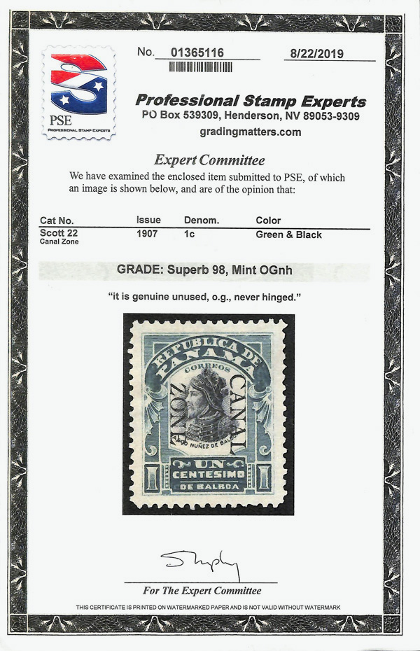 7359 nh 22 image1907, 1c Balboa, green & black (Scott 22), the SMQ does not currently price this issue, clean and vivid appearance, o.g., never hinged, Superb, with 2019 P.S.E. certificate graded SUP 98. (Image) (Image2) (All Images)
