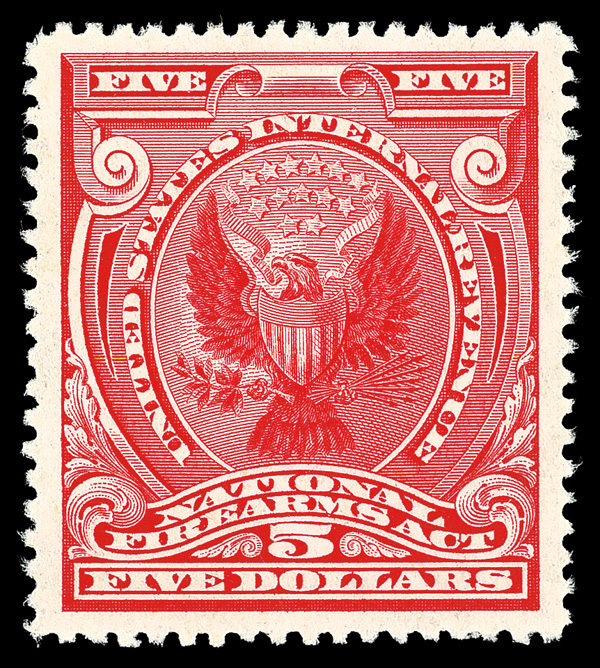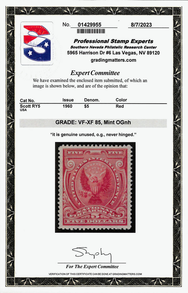 7321 nh RY5 imageFirearms Transfer Tax, 1960, $5 red (Scott RY5), stunning, vibrant hue, the SMQ does not currently price this issue, o.g., never hinged, Very Fine to Extremely Fine, with 2023 P.S.E. certificate graded VF-XF 85.