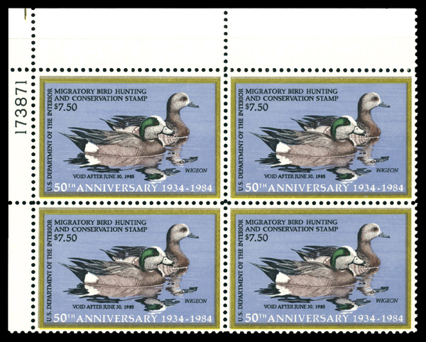 7330 nhbl RW51 imageFederal Duck Stamp, 1984, $7.50 Wigeons (Scott RW51), plate block of 4, o.g., never hinged, Extremely Fine.
