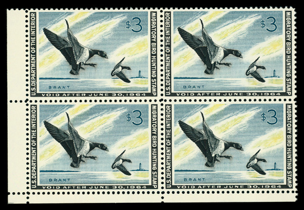 7325 nhbl RW30 imageFederal Duck Stamp, 1963, $3 Brants (Scott RW30), block of 4, o.g., never hinged, Very Fine.