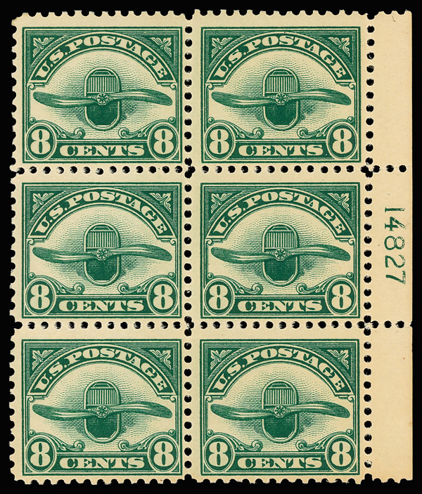 8672 ogbl C4 imageAirmail, 1923, 8¢ dark green (Scott C4), right margin plate number 14827 block of 6, with intense color; lightly hinged position 2, all others never hinged; faint overall toning, Fine.
