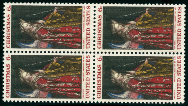 8644 nhbl 1363c image1968, 6¢ Christmas, light yellow omitted (Scott 1363c), block of 4, o.g., never hinged, Extremely Fine.