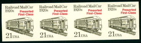 8652 nh 2265a image1988, Transportation Issue, 21¢ Railroad Mail Car, imperf. pair (Scott 2265a), o.g., never hinged, Extremely Fine.