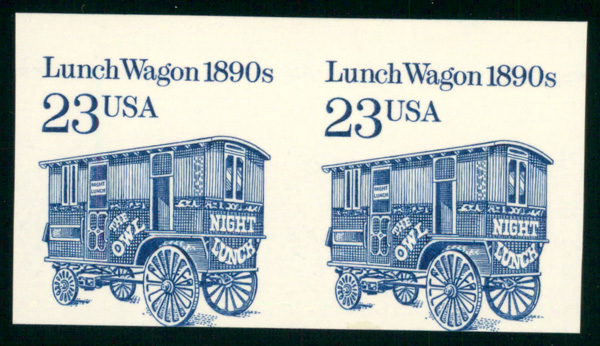 8654 nh 2464b image1991, Transportation Issue, 23¢ Lunch Wagon, prephosphored coated paper, imperf. pair (Scott 2464b), o.g., never hinged, Fine.
