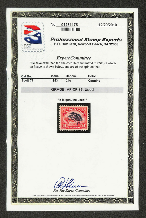 8675 O C6 imageAirmail, 1923, 24¢ carmine (Scott C6), black target cancel, Very Fine to Extremely Fine, with 2010 P.S.E. certificate graded VF-XF 85.