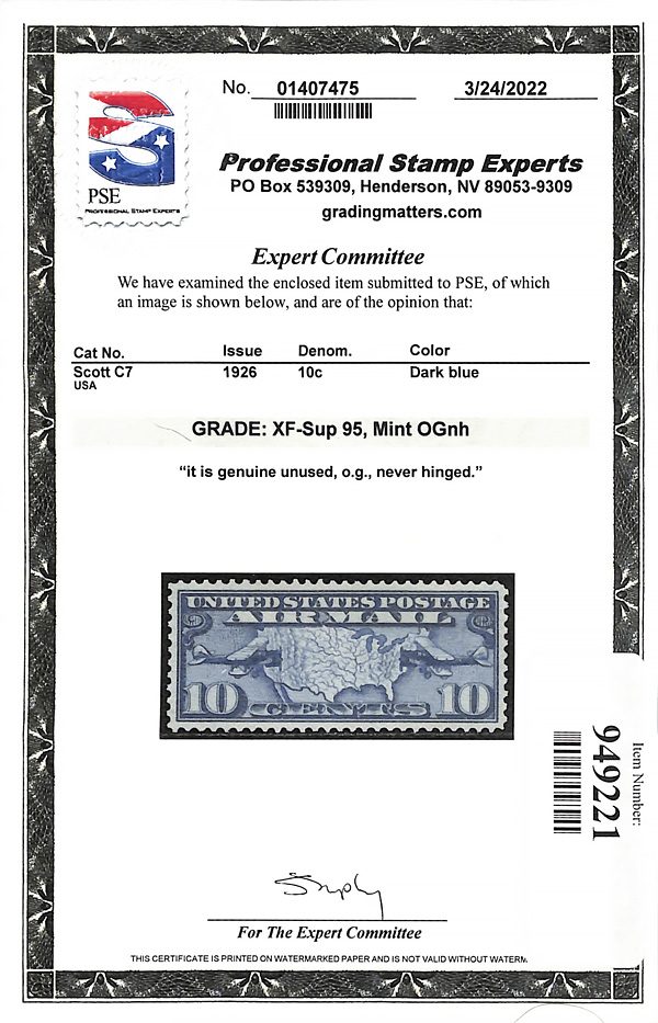 8676 nh C7 imageAirmail, 1926, 10¢ Map & Planes (Scott C7), o.g., never hinged, Extremely Fine to Superb, with 2022 P.S.E. certificate graded XF-SUP 95.