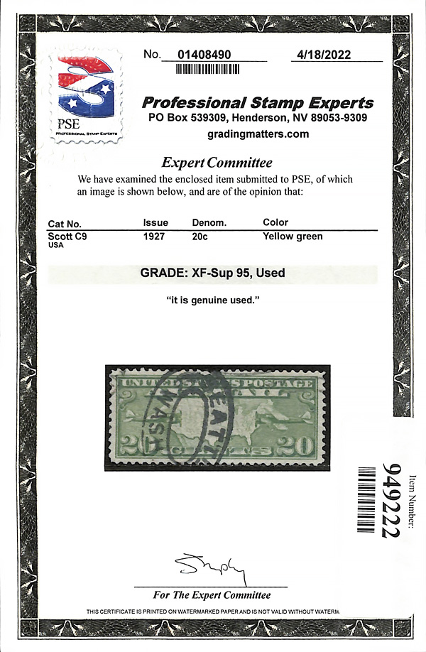 8680 O C9 imageAirmail, 1927, 20¢ Map & Planes (Scott C9), Extremely Fine to Superb, with 2022 P.S.E. certificate graded XF-SUP 95.