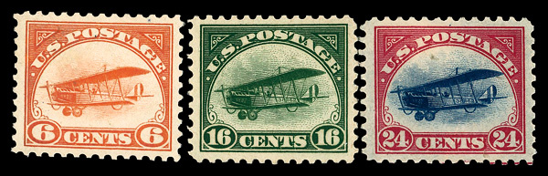 8667 og C1-C3 imageAirmail, 1918, First Issue, 6¢ to 24¢ complete (Scott C1-C3), set of 3, o.g., lightly hinged, each stamp is very well centered; C1 with light wrinkle, tiny inclusions on C1 and C3, Very Fine to Extremely Fine.