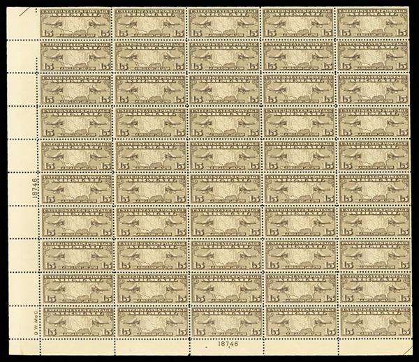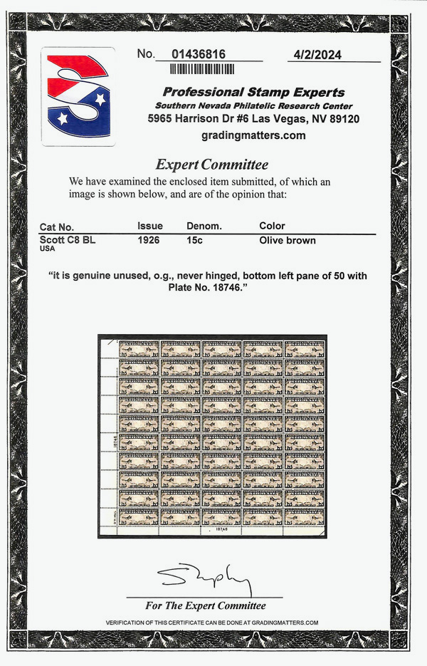 8678 nhbl C8 imageAirmail, 1926, 15¢ Map & Planes (Scott C8), bottom left full pane of 50 with plate number 18746, o.g., never hinged, Post Office fresh and sound with clean color and detail, Fine to Very Fine with better, with 2024 P.S.E. certificate.