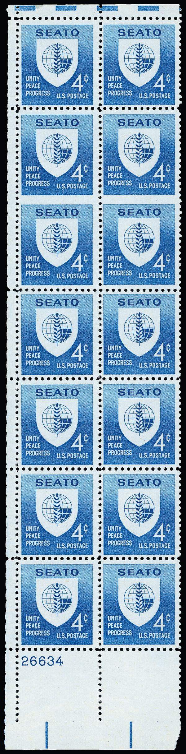 8641 nhbl 1151a image1960, 4¢ SEATO, vertical pair, imperf between (Scott 1151a), bottom left vertical plate number 26634 block of 14, the left two columns of the pane yielding two error pairs (rows 2-3), o.g., never hinged, pristine; previously folded (and slightly weakened) between rows 3 & 4 immediately below errors, less than 200 pairs reported, with 2021 P.S.E. certificate.