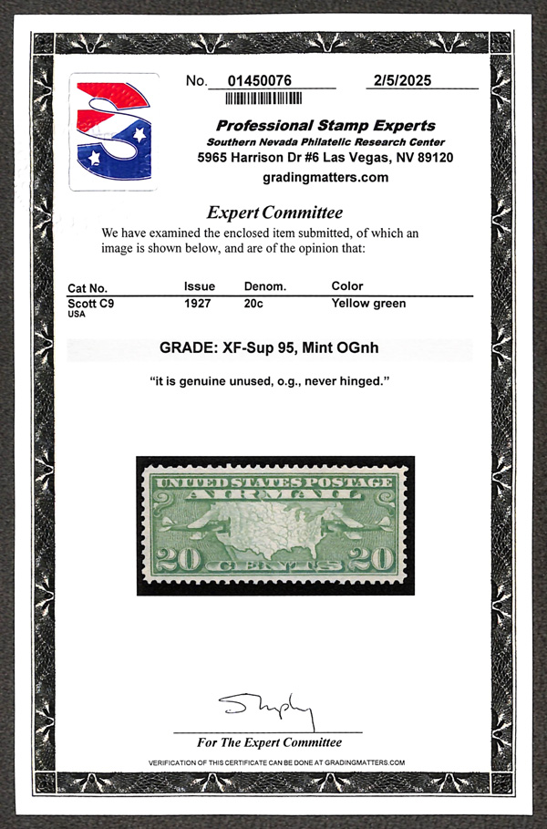 8679 nh C9 imageAirmail, 1927, 20¢ Map & Planes (Scott C9), Balanced and harmonious look, o.g., never hinged, Extremely Fine to Superb, with 2025 P.S.E. certificate graded XF-SUP 95.