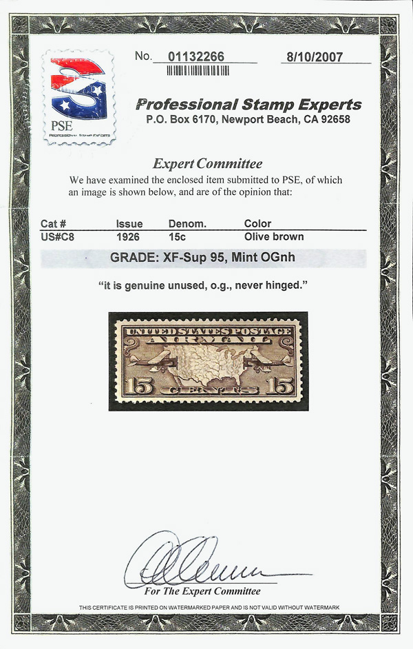 8677 nh C8 imageAirmail, 1926, 15¢ Map & Planes (Scott C8), o.g., never hinged, sharp and clean, Extremely Fine to Superb, with 2007 P.S.E. certificate graded XF-SUP 95.