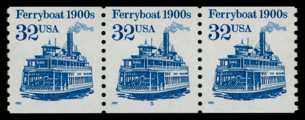 8655 nh 2466b image1995, Transportation Issue, 32¢ Ferryboat, "Bronx blue" color error (Scott 2466b), plate number strip of 3, plate #5, o.g., never hinged, Very Fine to Extremely Fine. (Image) Suggested Bid $37