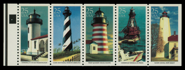 8656 BKnh 2474a image1990, 25¢ Lighthouses, booklet pane of 5 (Scott 2474a), plate #4, o.g., never hinged, Superb.