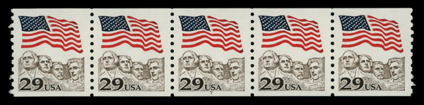 8659 nh 2523c image1991, 29¢ Flag over Mt. Rushmore, "Toledo brown" coil, plate 7 (Scott 2523c), plate number strip of 5, o.g., never hinged, Extremely Fine to Superb.