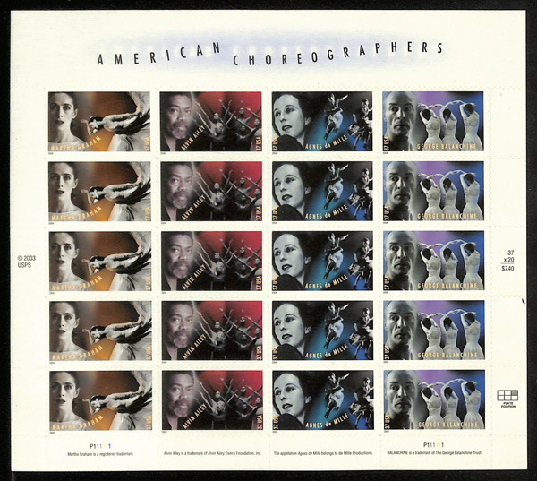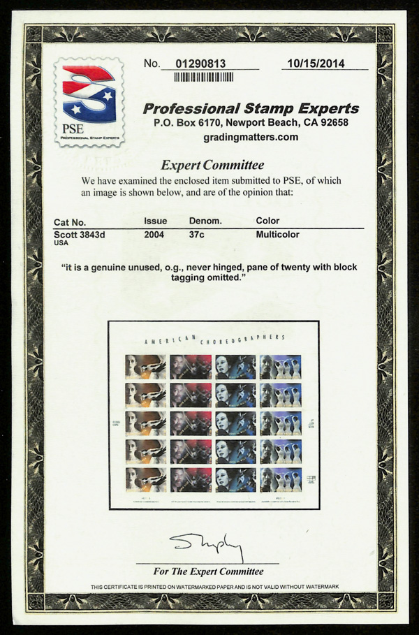 8664 nhbl 3843d image2004, 37¢ American Choreographers, se-tenant, block tagging omitted (Scott 3843d), pane of 20, o.g., never hinged, Extremely Fine, with 2014 P.S.E. certificate.