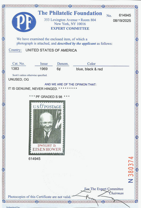 8645 nh 1383 image1969, 6¢ Eisenhower (Scott 1383), o.g., never hinged, Superb no SMQ price for SUP 98, with 2025 P.F. certificate graded SUP 98. (Image) (Image2) (All Images)