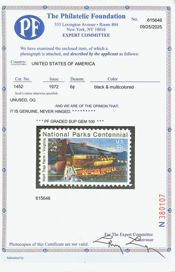 8647 nh 1452 image1972, 6¢ Wolf Trap Farm (Scott 1452), o.g., never hinged, Superb no SMQ price for this stamp, with 2025 P.F. certificate graded GEM 100. (Image) (Image2) (All Images)