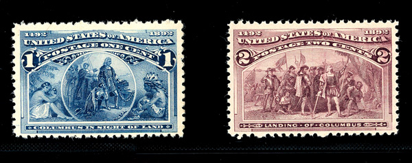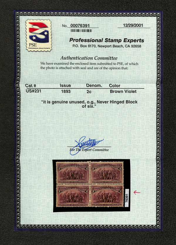 8069 nh 230 & 231 image1893, 1¢ & 2¢ Columbians (Scott 230 & 231), o.g., never hinged, Fine to Very Fine, with 2001 P.S.E. certificate for each.