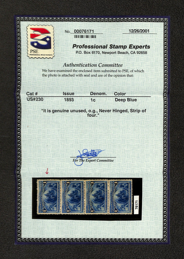 8070 nh 230 image1893, 1¢ Columbian (Scott 230), o.g., never hinged, Extremely Fine, with 2022 P.S.E. certificate graded XF 90.