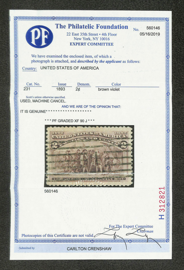 8071 O 231 image1893, 2¢ Columbian (Scott 231), nearly perfect centering, but a blind perf at the top stops the stamp from receiving a much higher grade, Extremely Fine, with 2019 P.F. certificate graded XF 90J.