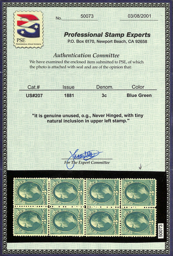8057 nh 207 image1881, 3¢ blue green, re-engraved (Scott 207), o.g., never hinged, Post Office fresh with bright color on matching paper; couple shortish perforations at top do not detract, Fine to Very Fine, with 2001 P.S.E. certificate for block of eight.