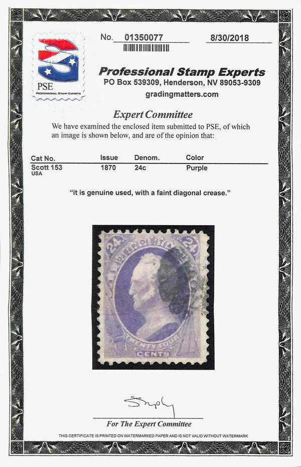 8047 O 153 image1870, 24¢ purple, without grill, N.B.N.C. printing (Scott 153), face-fresh with solid color and face-free cancel; faint diagonal crease, Fine to Very Fine, with 2018 P.S.E. certificate.