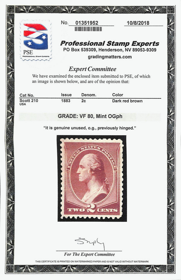 8059 og 210 image1883, 2¢ red brown (Scott 210), o.g., very lightly hinged, fresh and sound with deep color and clean detail, Very Fine, with 2018 P.S.E. certificate graded VF 80.