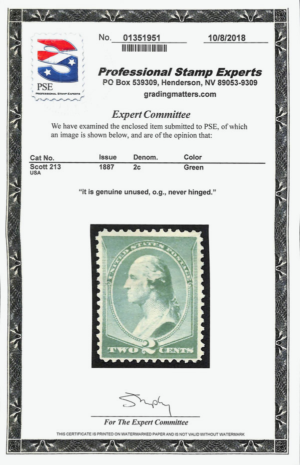 8062 nh 213 image1887, 2¢ green (Scott 213), o.g., never hinged, fresh and sound with bright color and clean impression, Fine to Very Fine, with 2018 P.S.E. certificate.