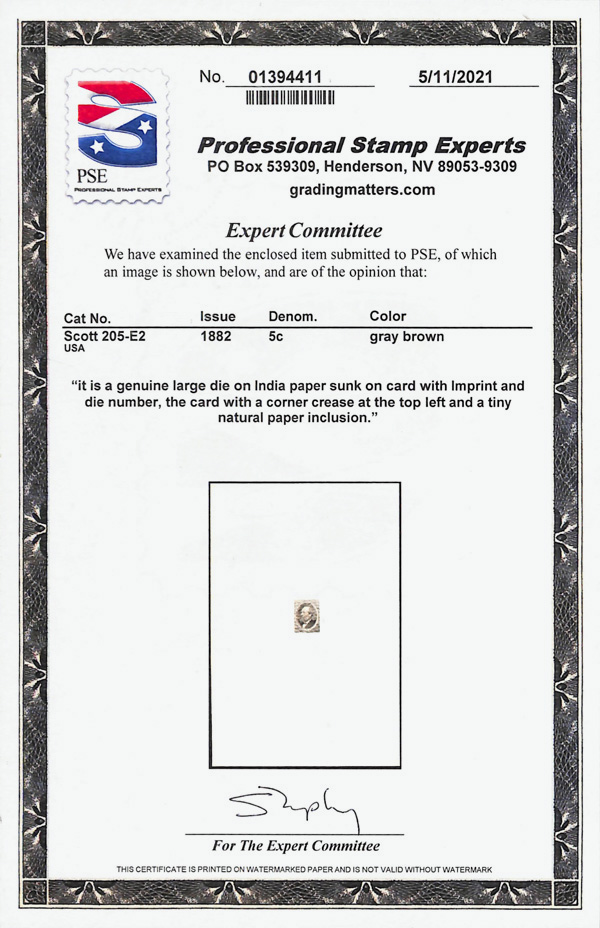 8056 E 205-E2 image1882, 5¢ Garfield, A.B.N.C. essay, in gray brown (Scott 205-E2), vignette with frame of horiz. lines, die on India, die sunk on card, fresh and crisp as expected, with title, American Bank Note Company New York imprint and die number "C-47" below design; India 70 x 81mm, card 147 x 219mm; the card with a corner crease at top left and a tiny natural paper inclusion, otherwise Very Fine, with 2021 P.S.E. certificate.