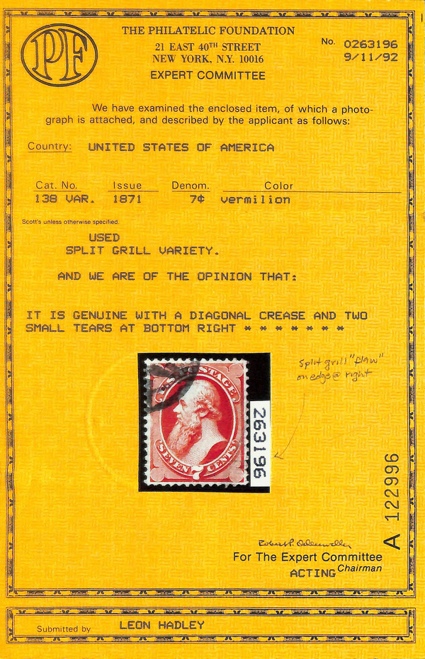 8045 O 138 image1871, 7¢ vermilion, H. grill, N.B.N.C. printing, split grill (Scott 138); small faults, Fine to Very Fine, with 1992 P.F. certificate.