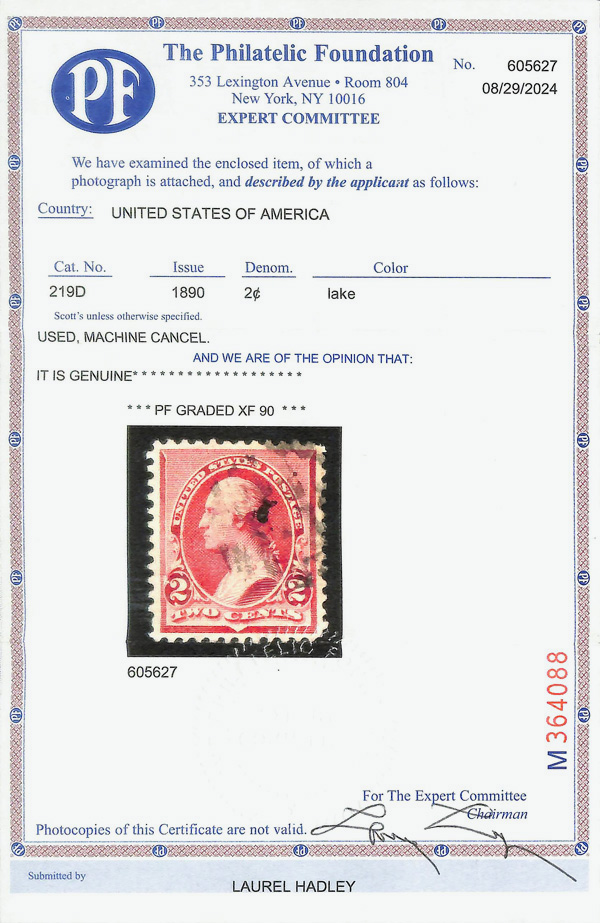 8065 O 219D image1890, 2¢ lake (Scott 219D), Extremely Fine, with 2024 P.F. certificate graded XF 90.