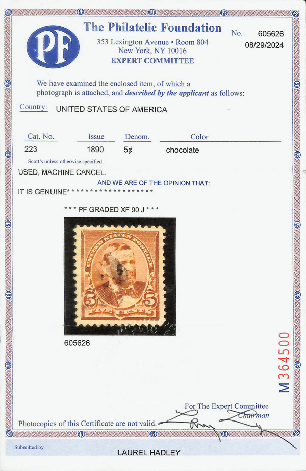 8067 O 223 image1890, 5¢ chocolate (Scott 223), Extremely Fine, with 2024 P.F. certificate graded XF 90J.