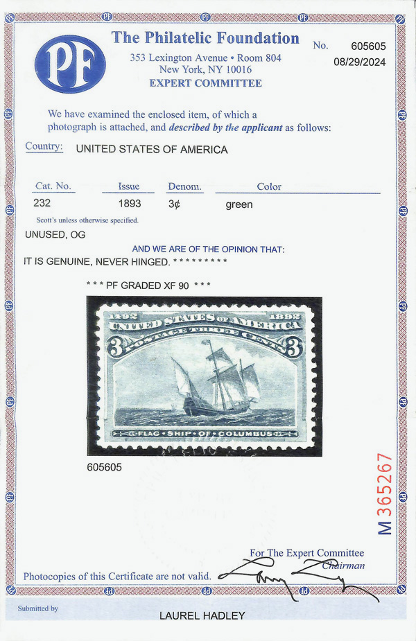 8072 nh 232 image1893, 3¢ Columbian (Scott 232), o.g., never hinged, Extremely Fine, with 2024 P.F. certificate graded XF 90.