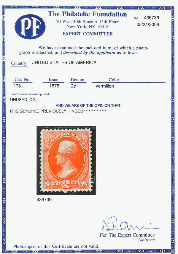 8052 og 178 image1875, 2¢ vermilion, C.B.N.C. printing (Scott 178), o.g., hinged, Extremely Fine, with 2006 P.F. certificate.