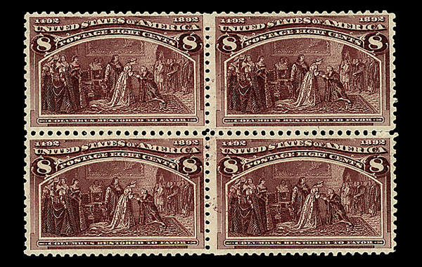 8078 nhbl 236 image1893, 8¢ Columbian (Scott 236), block of 4 (large horizontal separation), o.g., never hinged, Fine to Very Fine.