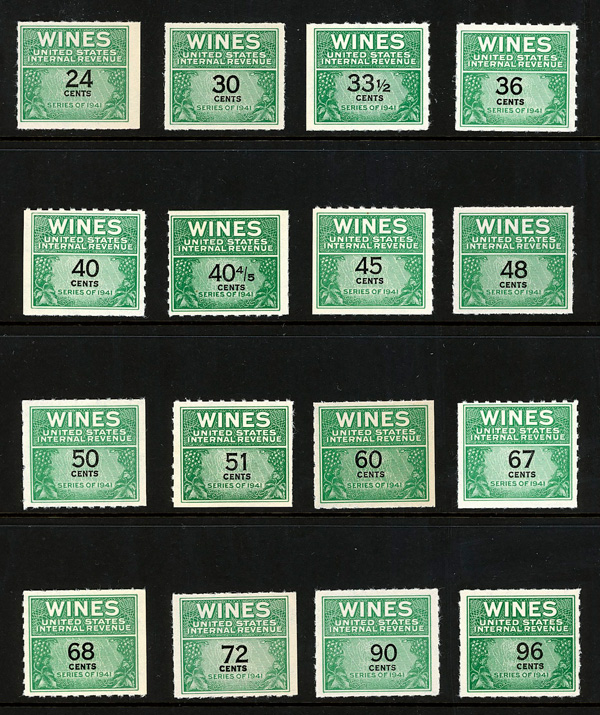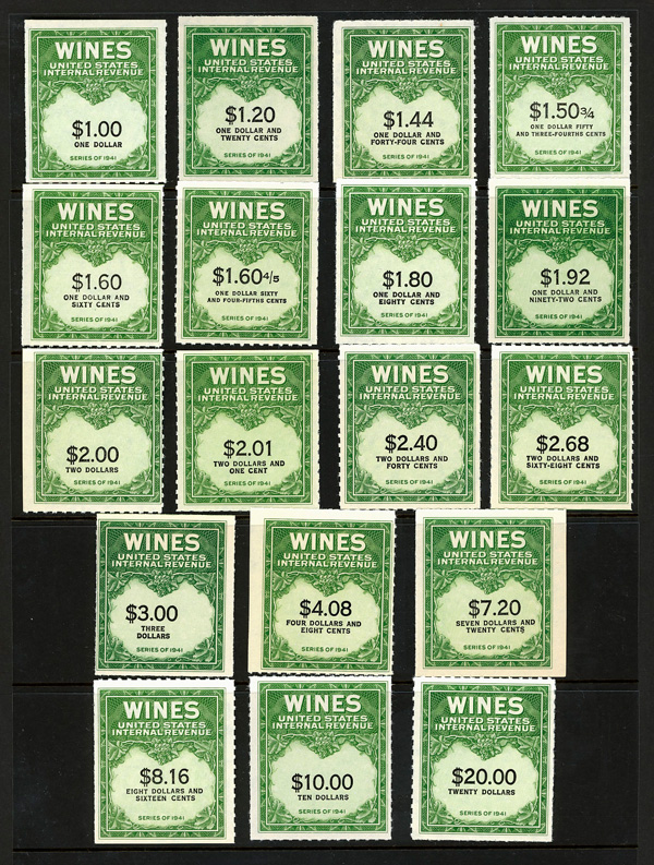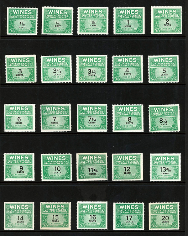 8807 ng RE108//RE203 imageWine Stamps, 1942-54, 1/5¢-$20.00 (Scott RE108//RE203), selection of 59 different, without gum as issued, Fine to Very Fine.